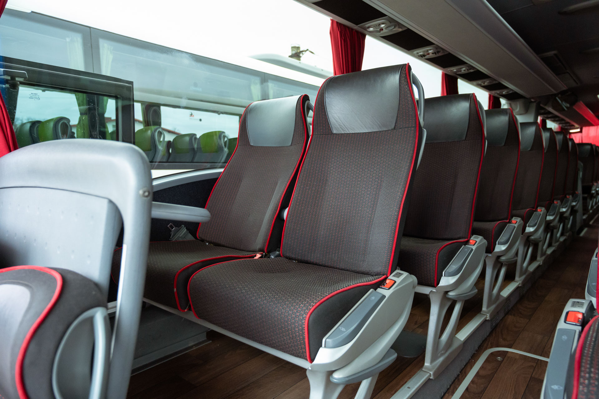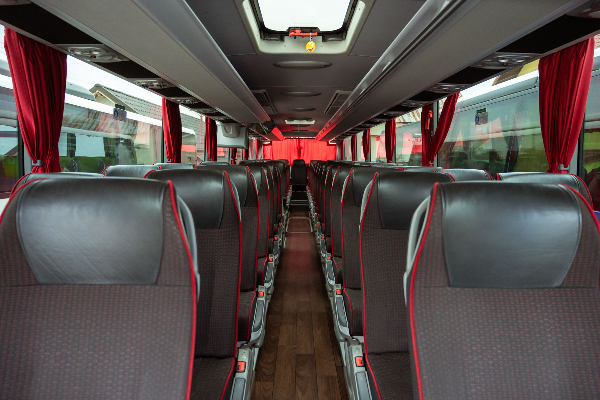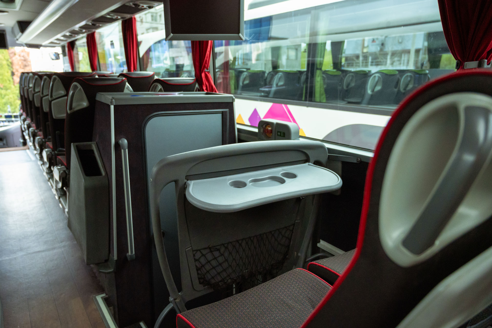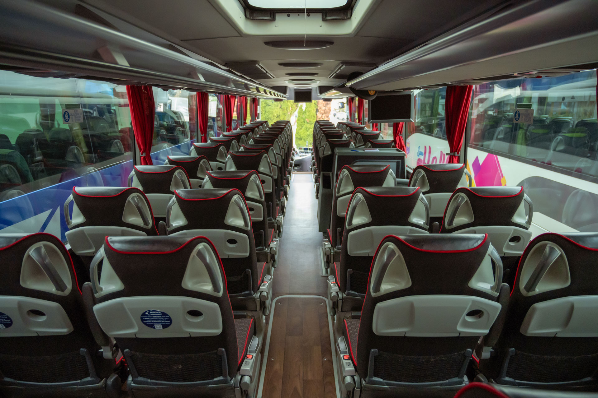 • 58 locuri + 1 pentru ghid, cu scaune rabatabile și distantabile, suport lombar și măsuțe individuale